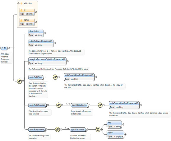 The configuration and execution of global analytics workflows is based on the management of appropriate digital models that specify the data sources, the data processing functions, as well as the edge gateways entailed in these workflows. The digital models provide a representation of such analytics workflows and enable the management of this representation (e.g., its execution of updates and deletion of operations). To this end, the digital models that empower the configuration of the DDA follow a hierarchical structure, which specifies the different relationships between the various entities. This structure specifies that an edge gateway comprises multiple data sources, each of which has its own definition and can be instantiated multiple times. Moreover, each instance produces data associated with the data sources. As an example, Figure 3 illustrates a snapshot of the digital models’ structure, which shows the association of APM (Analytics Processor Manifest) with various data sources. The role of the APM is illustrated in the following paragraph.