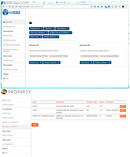 The DDA engine has been implemented as open source software and it available at GitHub at: https://github.com/far-edge/distributed-data-analytics. This open source version comes with distinct modules for the EA-Engine, the DA-Engine and the Open API for analytics. Moreover, it provides some utilities that simulate the operation of the DR&PR component in order to ease the development of demonstrators based on simulation of data streams. The implementation comes with a dashboard that enables management of the DDA deployment, including management of EA-Engine instances and the processors that they comprise. Through the dashboard, application developers and deployer can configure most of the parameters of the DDA, including the analytics functions of the analytics processors, the parameters of the storage processors and of the preprocessors, the deployment of EA-Engines in various edge gateways and more. Two snapshots of the dashboard are depicted in Figure 7. They correspond two different customizations of the dashboard for different projects (i.e., H2020 FAR-EDGE, H2020 PROPHSY) and use cases, in different plants that comprise distinct sets of data sources. Note that the FAR-EDGE dashboard is also illustrated in [24].