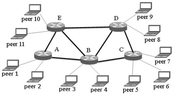 We introduce our basic idea of peer selection algorithm while considering the network state by Figure 1. As shown in the figure, if peer 1 chooses peer 5 as its neighbor, then it is likely that they will share existing file fragments with each other, thus increasing the business requirements between routers A and C. If the traffic relaxation of router A to C is smaller than that of router A to other routers, then peer 1 should try not to choose the peer under router C, because it is possible to increase traffic between A and C, and the traffic relaxation between A and C is further reduced. Therefore, peer 1 should select the peer under the router with a large amount of traffic relaxation to establish a connection. We need the traffic relaxation of peer 1 (router A) to other routers to be distributed to each peer under it, since the number of peers under different routers is usually different. There will be a situation that multiple nodes choose the same node, since each peer does not coordinate with each other in peer selection. We use the probability selection method to make each peer’s probability of being selected proportional to its allocated traffic relaxation, so as to achieve distributed coordination among peer neighbor selection. In addition, peer 1 chooses peer 2 under the same router, which only generates intra-domain traffic, and it does not increase the traffic between routers; therefore, peer under the same router can be given higher priority, so that P2P traffic optimization that is based on location awareness can be realized [28].