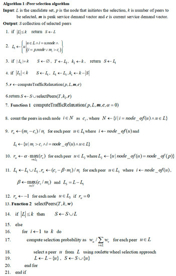 Function 1 calculates the traffic relaxation in each peer in the candidate peer set L of peer p, and then returns the result as a vector. The node set of network is N (line 1), L1 represents the peer with positive traffic relaxation (line 2), and L2 represents the peer (line 3), which is under the same node with p. Line 4 calculates the number of peers under each node and then divides the traffic relaxation between nodes (lines 5 and 7) to obtain the traffic relaxation of each peer. The peer in L2 is under the same node with p, so they are given higher priority and they can be adjusted by parameter α (line 6). The traffic relaxation of peer in L–L1–L2 is not positive, thus special treatment is carried out, so that the absolute value of the traffic relaxation obtained is still proportional, but with a negative sign (line 7). Finally, the result is returned, that is, the traffic relaxation vector r of the peer (line 8). Function 2 chooses k peers from set T by probability according to the value of the weight vector w and returns the result as a set. If the number of peers in T is less than k, then it directly returns. Otherwise, select k peers from T to set S (lines 2–6). For each selection, the weights of the remaining peers in T are normalized (line 3) as probability, and then a peer (line 4) is selected while using roulette gambling [21] by the probability, and the peer is removed from T to S (line 5). Finally, return to the set S (line 6).