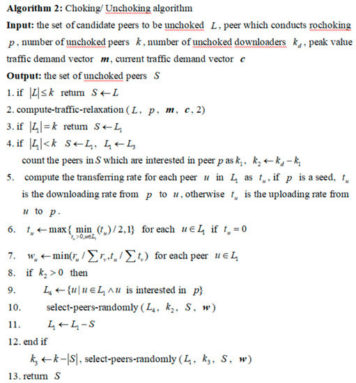 The choking/unchoking algorithm of the original BT protocol [29] embodies the idea of “Tit-for-Tat”, namely that deciding the node to be unchoked by us according to the upload rate of the node to us, which is the so-called “All for one and one for all”. We improve the choking/unchoking algorithm by considering the network state, which becomes a double-parameter selection problem. In other words, the upload rate and the trafffic relaxation of the peer should be simultaneously considered when selecting the unchocked peer. The priority of any peer with a smaller value should be lower in order to maintain fairness between all the peers and the whole network performance. In our algorithm, the double parameters are normalized first, so that they have the same value range. Subsequently, the smaller of the two parameters is taken to use, so that the double-parameter selection problem is transformed into a single parameter selection problem. Finally, the peer that is unchocked is selected by a probabilistic selection method that is similar to algorithm1. Figure 3 shows the detail pseudo-code of our improved choking/unchoking algorithm.