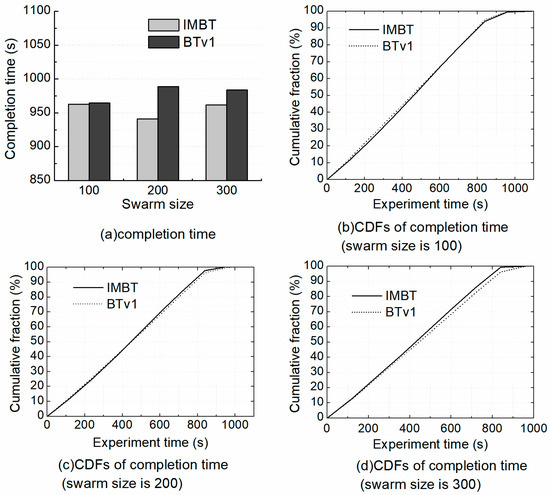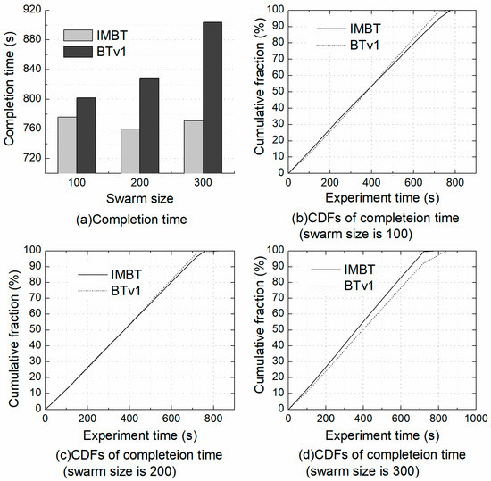 Figure 6 and Figure 7 show the completion time of the completes file download of the three BT groups in Abilene and Germany50 networks. First, it can be seen from Figure 6a and Figure 7a that the completion time of our improved BT protocol (identified by the IMBT in the figure) is, in most cases, shorter than the original BT protocol [27] (identified by the BTv1 in the figure).