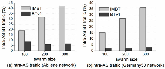(a) is intra-domain traffic of IMBT and BTv1 under different swarm size of Abilene, and (b) is intra-domain traffic of IMBT and BTv1 under different swarm size of Germany50.