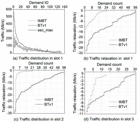 Traffic distribution and traffic relaxation distribution of Abilene (under the size of BT group is 200). (a) is the traffic distribution of business requirements of IMBT, BTv1 and peak, (b–d) is the traffic relaxation in slot 1,slot 2 and slot 3.