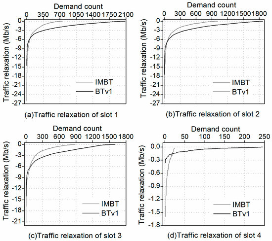 (a–d) is the traffic relaxation in slot 1,slot 2,slot 3 and slot 4 of IMBT and BTv1 of Germany50 under the size of BT group is 300.