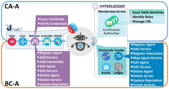 - An agent handling the registration in a given agent community. In particular, the CA-A is in charge of interacting with the certification authority (CA) component of Fabric; the CA-A also offers the possibility of encoding rules and conditions for the enrollment. In the settings of multiple CAs, available in more recent versions of Hyperledger Fabric, similar multi-signature approaches can be employed to manage multiple CA-As.