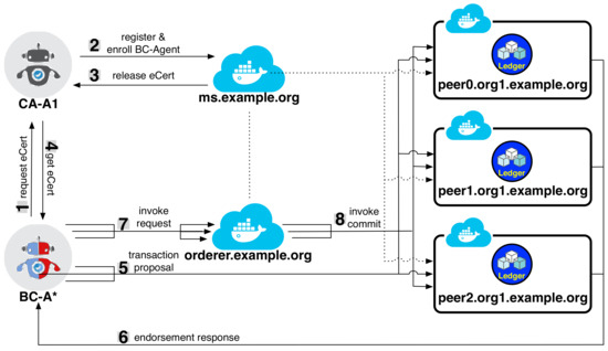 The implementation of the architecture described above constitutes a concrete example of how BCT and MAS can be implemented using currently available technologies. In particular, this implementation enhances and extends the seminal system proposed in [10]. Figure 2 schematizes the dynamics among the main components (i.e., agents, membership service, orderer, and peers running the ledger) characterizing the developed system. In this implementation, every agent () hosts a peer that maintains the ledger and executes the chaincode. Nevertheless, it is possible to decouple agents and peers (distributing them over the network) updating the configuration files.