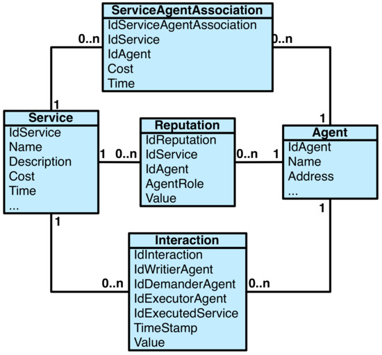In the developed system, the composite key is characterized by agentId-serviceId-agentRole-reputationId; this key is the pointer to a given value (address: reputationId) in the DB. This enables execution of the queries such as “SELECT Agent(s) WHERE (...)” (partial-key queries). Moreover, if more complex queries are necessary, the system executes partial keys and simple queries in cascade. Such an index is not required to be associated with a value. Hence, the queried values can be extracted from the composite index itself.