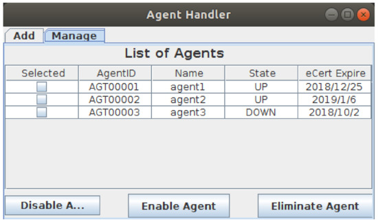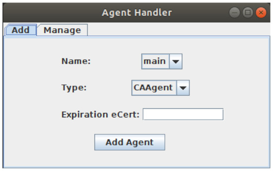 The agents’ behaviors are both automated and manual (actions and choices are delegated to the user). To interact with the agents manually, and therefore with the blockchain, there is the classic command line interface and a customizable graphical interface. Figure 4 shows the interface that enables to create and register the agents (needed to test the platform). Figure 5 presents the interface to manage such agents (e.g., enabling, disabling, and eliminating agents).
