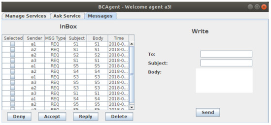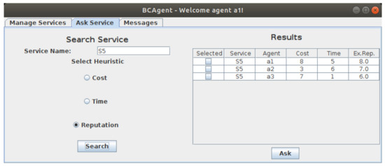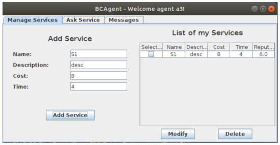 Figure 6 shows the interface that enables adding and modifying the services offered by a given agent. To require a service execution, we provide the interface depicted in Figure 7. A pre-filtering and sorting can be applied by selecting the optional features (e.g., cost, time, and reputation). Finally, an interface developed to accept or reject requests, to communicate with other agents, and negotiate the interface to compose and manage the messages is shown in Figure 8.