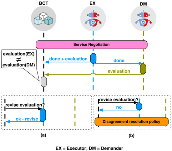 Business collaborations demanding for high reliability, shared, trusted, privacy preserving, immutable data repositories, and smart contracts’ execution are already benefiting from the simple employment of BCT [52]. However, to broaden the spectrum of advantages and possibilities, coupling BCT based systems with MAS paves the way to brand new possibilities, e.g., by simplifying the distributed governance of groups of people. It may also help enhance the dynamicity of the interactions, henceforth lowering the transaction costs, for reaching an agreement, still complying with standardized rules [53]). MAS are characterized by entities driven to maximize their own cost function. Thus, malicious or unwanted behaviors may arise. Tracking the interactions of intelligent agents on an immutable registry can prevent situations where two or more parties make conflicting claims about specific transactions (e.g., whether a payment or a service has been performed). Hence, in the developed system, the disagreement resolution policy allows spotting and disambiguating misalignment concerning a service execution, while keeping immutable track of the time of that occurrence (possibly being malicious or an honest mistake).