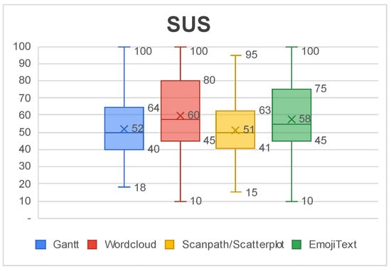 Figure 23 shows a box-plot of SUS scores for each visualization. The average SUS score of all visualizations falls in the range 51–68, which is classified as a regular level of usability that has room for improvement. The Gantt Chart and Scanpath/Scatterplot had the worst usability level and they were also the ones with the lowest level of accuracy. The Wordcloud and EmojiText had better usability reports, around 58 and 60 in the score. This score can serve as a guide to prioritize further redesigns.