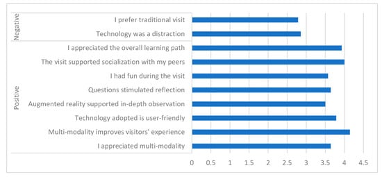 Participants were asked to assess their level of agreement with two negative statements and eight positive statements regarding the exhibition on a Likert scale from 1 (totally disagree) to 5 (totally agree). It is possible to see that the average scores for the two negative statements is lower than 3 (Figure 3). Thus, in average, participants did not prefer the traditional visit (average = 2.78) compared to the multi-modal exhibition, and technology was not a distraction for them (average = 2.86).