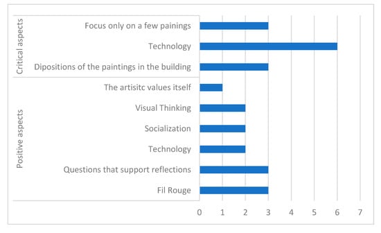 In Figure 5 the positive and negative aspects of the Tito Rossini’s exhibition according to participants are presented. The most appreciated features of the exhibition were the opportunity to identify a Fil Rouge among the paintings and to be stimulated by questions designed to support reflection. Technology was considered in both positive and critical aspects. Specifically, people with an iOS system would like to have the opportunity to install the app on their mobile phone. However, the experimentation was run with a limited amount of resources, thus it was not possible to design the App also for iOS system at this stage of the project. Participants would also like to have the time to focus also on the other paintings and they did not always appreciate the arrangement of the paintings in the building.