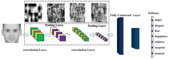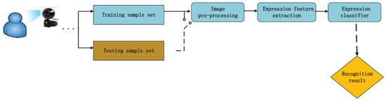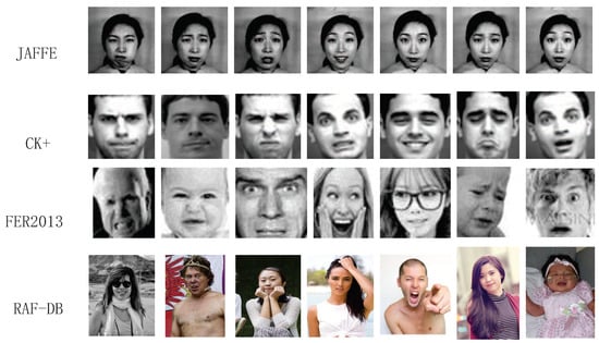 Facial expressions include rich emotional information and play a very important role in interpersonal communication. Facial expression recognition has become one of the most promising biometric recognition technologies due to its characteristics of nature, intuition, non-contact, safety, and rapidity. According to a famous expression theory []: in the 100% emotional expression that is composed of facial expression, voice, and language, expression makes up 50 percent of the total information, 40 percent is composed by voice, and language only includes 8 percent, which shows the importance of facial expressions in interpersonal communication. In order to realize a more intelligent and natural human–machine interaction, facial expression recognition has been widely studied in recent decades [,], and it has attracted more and more researchers’ attention.
