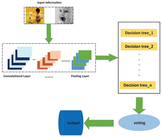 This paper focuses on expression recognition by combining the random forest with features extracted from the CNN model and finds the most suitable fusion method based on the real experiment environment. The original data will have a certain information loss after going through every layer of the CNN model. When the original data reaches the full connection layer, the nature of the raw data has become distorted, therefore, random forests cannot be directly put on the CNN structure. The most reasonable way is to put the random forest into the last pool layer, which can be seen in Figure 3.