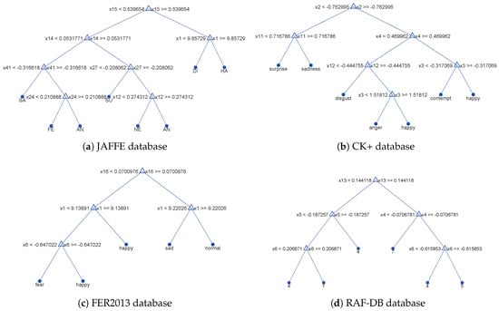 For JAFFE database and CK+ database, 70% of the augmented data is taken as the training set and 30% of the data is taken as the test set. For FER2013 database and RAF-DB database, the training set and the testing set are used by the existing samples. Figure 5 shows some decision tree models that were generated in our experiments. Table 3 shows the experimental results obtained by different feature extraction methods and classification methods in this paper. Figure 6 shows the obvious differences between these different methods.