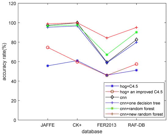 As can be seen from the results in Figure 6, the expression classification ability based on “handcrafted” feature is generally lower than that based on CNN feature under the same classifier. The recognition performance of random forest based on probability selection is higher than that of traditional random forest. The experimental curves can be seen in Figure 7. Figure 8 shows the comparison of classification capabilities obtained by the new method that was proposed in this paper and other methods’ performance on JAFFE database, CK+ database, FER2013 database, and RAF-DB database, which verifies that this method has certain advantages over other methods.