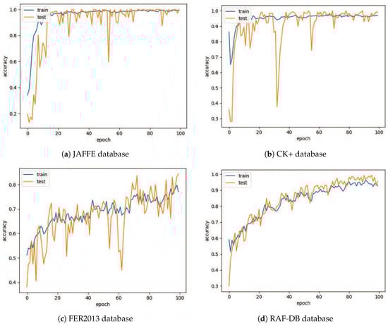The experimental number of four databases: Extended Cohn–Kanade Dataset (CK+), JAFFE, FER2013, and Real-world Affective Faces Database (RAF-DB).
