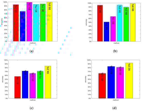 The comparison between the new method and some state-of-the-art methods in papers on four experimental databases. (a) JAFFE database. From left to right, results come from [,,,,] and the new method proposed in this paper; (b) CK+ database. From left to right, results come from [,,,,] and the new method proposed in this paper; (c) FER2013 database. From left to right, results come from [,,,] and the new method proposed in this paper; (d) RAF-DB database. From left to right, results come from [,,] and the new method proposed in this paper.