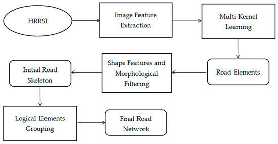 - Road elements are roughly extracted by multi-kernel learning and multi-feature fusing (MKL). About 8% of the road samples and 10% of the non-road samples are taken for classification learning, and the MKL-SVM classifier is obtained to divide the image into two categories: Road and non-road. This step provides candidate road elements.