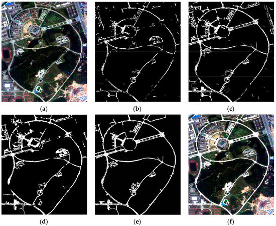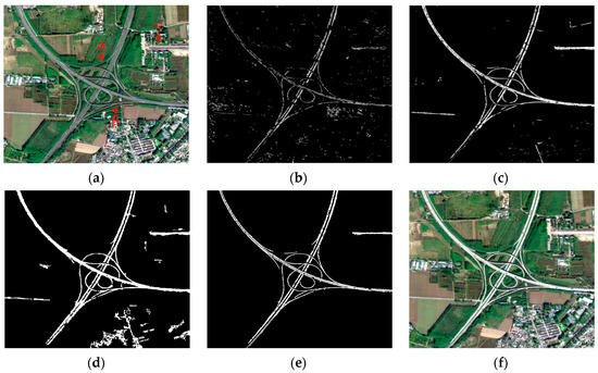 - Region-based classification (RBC) [22] is a semi-automatic approach that first segments the image and combines adjacent segments by Full Lambda Schedule. The SVM classifier is then used to classify the segmented region by spatial, spectral, and textural features of the image, and the initial road skeleton is obtained. Finally, the quality of the detected road skeleton is improved by using morphological operators.