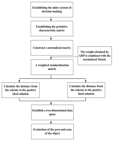 TOPSIS is a sequential optimization method for the similarity of ideal objectives. It is very effective in multi-objective decision-making analysis [30,31,32,33]. By normalizing the original data matrix after trends, the corresponding data matrix that is normalized is established, and the best and worst schemes are identified from many schemes. Then, the distance between all index values of each evaluation object and the positive and negative ideal solutions are calculated separately; thus, we can obtain the closeness between the evaluation object and the ideal solution, and the ranking is the basis for evaluating the quality of the object. Because the TOPSIS method uses the relative approximation between ideal solutions to arrange the priority order among different schemes, the TOPSIS method is improved by referencing the literature to avoid contradictions. A two-dimensional data space method is established by changing the closeness degree between the final objective and the ideal solution into all the index values of the known evaluative objects and the distance between the positive ideal solution and the negative ideal solution to relieve the contradiction and decrease order problems. The flow chart of the improved TOPSIS algorithm is as follows (Figure 2):