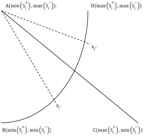 The reasons for using the improved TOPSIS approach is that the improved TOPSIS considers the relative closeness degree of each evaluation object to the best and worst plan. Referring to the literature and examples, the disadvantage of using the traditional TOPSIS method is that the best solution and the worst solution of the decision-making scheme may change when new decision-making schemes are added, which leads to the reverse order of our ranking. If there are two evaluation objects about point A and point C symmetry, we have and , and if using the traditional TOPSIS method, the result will conclude that the two evaluation objects are of the same quality; however, this is not the case [28,29].