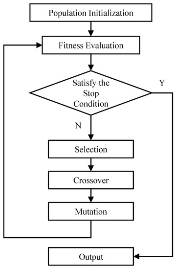 The genetic algorithm [18] is an adaptive heuristic optimization algorithm based on natural selection and genetic evolution. It is the basis of a large class of evolutionary algorithms, which generates new solutions through a series of evolutionary operations, such as selection, crossover, mutation, and so on. In recent years, several enhanced GA variants have been proposed to improve the search performance [20,21,22]. The general algorithm framework of the genetic algorithm is shown in Figure 1.