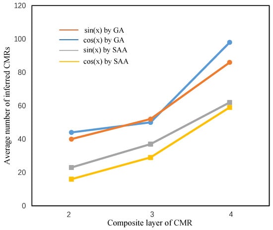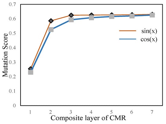 As shown in Table 4 of Section 4.3, with the increase of the number of composite layers, the corresponding mutation scores also show an upward trend, and there are simple statistics shown in Table 7. We see from Table 7 that the average mutation scores of the two trigonometric functions increase with the increase of the number of composite layers, and the average mutation scores of 3-CMR and 4-CMR are relatively close. Thus, in order to verify the influence of composite layers on inferred CMRs, we increase the number of composite layers of the CMRs. The obtained relationship between the number of composite layers and the average mutation scores of the CMRs is shown in Figure 5.