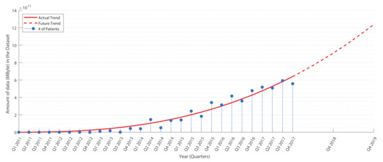 In more detail, Figure 1 shows real data collected from a medical examination center, used in this work to validate the proposed system (see Section 4.7). During the observation period from 2011–2017, the collection rate of clinical data showed a rapidly increasing rate. At the end of the observation period, there was a production of about 2000 patient records per quarter (about 600 GByte per quarter). An estimation of the growth factor indicates a production of about 5200 records per quarter (about 900 GByte per quarter) at the end of 2018 (collecting up to about 7500 records in late 2019, about 1.3 TByte per quarter). These numbers give an indication of how the data grow quickly, promising to reach large volumes of data in a few years.