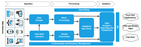 During the ingestion stage, information coming from different data sources (e.g., EHR repositories, medical sensors and mobile devices) is gathered by the system. The architecture includes facilities to store data in a distributed file system that can hold high volumes of large files in various formats (data storage) and to capture and store real-time messages for stream processing (real time ingestion).