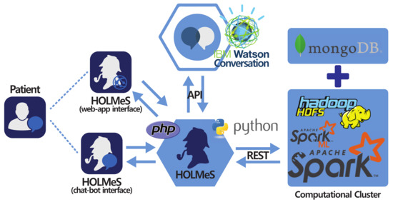 HOLMeS (health online medical suggestions) system main modules with interaction paradigm: At the bottom-centre, the HOLMeS application core; On the left, the HOLMeS chat-bot (bottom) and the patient (top) interacting with HOLMeS; At the top-centre the, IBM Watson conversation logic adopted by HOLMeS through its API; On the right, the computational cluster providing storage, computing, and machine learning services used by HOLMeS.