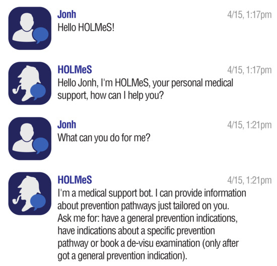 - General-level prevention evaluation, in which the user can query the HOLMeS system, through the chat bot, in order to have the first medical prevention advice, submitting some simple clinical features, such as age, height, weight, living place, smoking status, some disease familiarity, and so on.