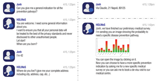 - Specific disease prevention evaluation, in which a user can query the HOLMeS System, through the chat bot, in order to have more detailed prevention advice about a specific disease by submitting more specific features, such as results examination, blood pressure, respiratory and heart rate, oxygen saturation, body temperature, and so on.