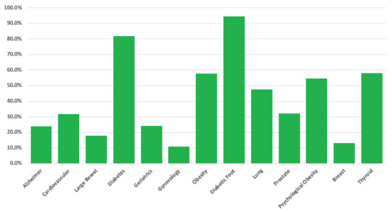 The results of a general-level evaluation conversation are similar to those reported by the graph in Figure 8. The idea is that a histogram can easily highlight the patient’s occurrence risk associated to each disease on the basis of the collected data, guiding him (i) to take a de-visu examination with the proper physician or (ii) to proceed to the specific-level evaluation for the most risky pathologies, in order to have more reliable results (since based on the answers to more specific questions).
