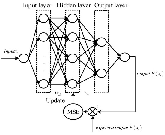 Due to frequent operations intended for human interaction, users easily tire. The construction of the surrogate model is conducive to reducing user fatigue, expanding the search scope of the algorithm, and increasing the diversity of the population. As a non-linear information dynamics model, BP neural networks realize non-linear mapping from input to output and have good fault-tolerant, adaptive, and generalization characteristics. BP neural networks are mainly applied to problems of approximate function, pattern recognition, data compression, and classification. Based on a human user’s own historical evaluation information, the surrogate model in this paper obtains the modified fitness using Equation (2) as the labeled samples, adopts K-folded cross validation to train the BP neural network surrogate model, and divides the data into k parts. Each piece of data was selected in turn as the test data, and the remaining k – 1 parts as the training data. As the three-layer BP neural network has a continuous mapping capability from arbitrary input to output, this model adopts the three-layer BP neural network: input layer, hidden layer, and output layer, where and represent the connection weight of neuron nodes in the input layer and hidden layer, hidden layer, and output layer, respectively. The unipolar sigmoid function is used as the transfer function. The number of the input layer is determined by the component number of the evolving individual . The number of nodes of neurons in the output layer is 2, which represents the upper limit and lower limit of the predicted interval fitness . The number of hidden layer neuron nodes was determined using in Lin et al. [29]. and are dynamically adjusted using gradient descent technology, such that the objective function measured by MSE is . When the error accuracy requirement is met, the training ends, and the cognitive surrogate model based on BP neural network is obtained. The topology of the surrogate model is shown in Figure 2. The model is used to predict the fitness of subsequent evolution individuals to reduce user operational burden.