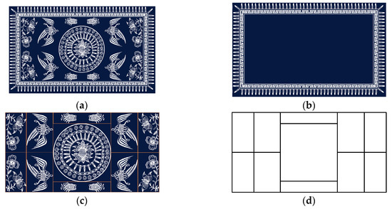 We collected a large number of batik shape patterns to analyze their characteristics, as shown in Figure 3. A batik shape tablecloth is shown as an example in Figure 3a. Generally, a batik shape pattern can be divided into a border pattern, which is shown in Figure 3b, and the main pattern, which is shown in Figure 3c. The main batik pattern can be separated to extract a specific pattern structure, as shown in Figure 3d.