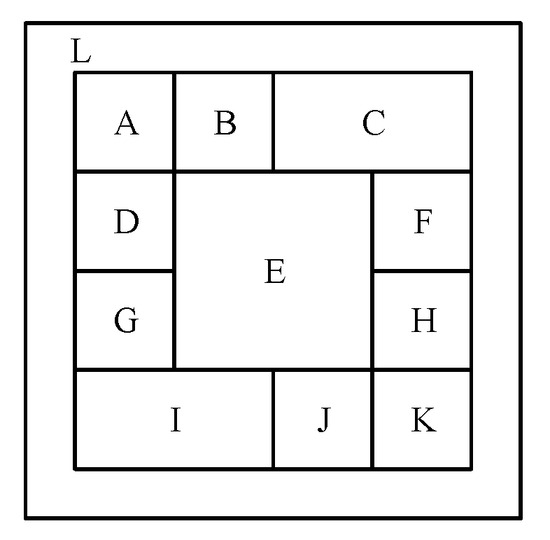 Customers’ display performance requirements consist of several sub-requirements . In this paper, display performance is coded according to the customer’s pattern structure, the specified pattern type, and the pattern size requirements. The pattern structure requirement is taken as an example, as shown in Figure 4. The L module is the border pattern; modules C, E, and I are both mainly patterns that mostly reflect the meaning of the pattern. The pattern type is specified by the customer; other modules are decorative patterns. As the batik pattern style is mostly two-square continuous or four-square continuous, eight patterns were randomly selected from the decorative pattern library, and they were rotated to a fixed angle for the decorative module gene library. The main pattern modules C and D (dragon patterns) and module E (bronze drum patterns) are taken as examples. The gene pool of each module included eight patterns, the values of coded decimals ranged from 0 to 7, which was converted to 3-bit binary code, then the search space contained candidate solutions.