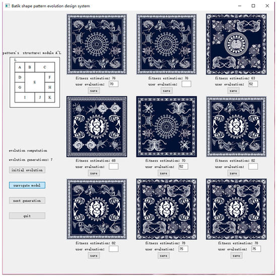 The system was programmed with PyQt 5, which was developed by Riverbank Computing in Wales, England, and the operating system interface is shown in Figure 5. The user clicks the initialization button, the system automatically generates the initial evolution population, and provides a display. Then, a human user evaluates the evolutionary individuals according to their preferences and clicks the next generation button, and the population conducts the selection, crossover, and mutation operations to generate new populations. If the human user’s evaluation generations exceed five, the agent model can be selected to replace the user evaluation, which means there are more than 45 labeled samples. The system takes the evaluation results of the first five generations of individuals, which means 45 labeled samples are automatically taken as the initial training data. Then, the system divides the samples into three parts to adopt K-fold cross validation to train the BP neural network cognitive surrogate model. The system estimates the adaptive value of each generation of evolution individuals, and the population carries out genetic operations to generate new populations. The surrogate model represents the optimal individual of each generation and the predicted adaptive value after nine generations. If the predicted value deviates from the user’s expectations, the user can submit the evaluation again, and the system will update the training data set automatically. If , then the model will update automatically. The process repeats until the human user finds a satisfactory evolutionary individual.