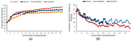For the convergence performance of IGA-BPFIF, Figure 6 compares the fitness of evolutionary individuals. The y-coordinates in Figure 6a,b represent the average fitness of all evolutionary individuals and the average width of interval fitness, respectively. The interval fitness of the evolutionary individual is determined by the upper and lower limits of the interval ; the x-coordinate represents the number of iterations. The four curves represent the trend of each generation of the evolution individuals of IGA-T, IGA-IIF, IGA-NNISF, and IGA-BPFIF. As can be seen from Figure 6a, the average fitness of IGA-BPFIF gradually increased with the increase in evolution generation, indicating that the evolution direction conforms to the cognitive rule. Figure 6b shows that although the average width of the interval fitness fluctuates a little, the overall trend gradually decreased, indicating that the uncertainty of user evaluation gradually decreased. As IGA-NNISF adopts the interval fitness in IGA-IIF, the average fitness was the same.