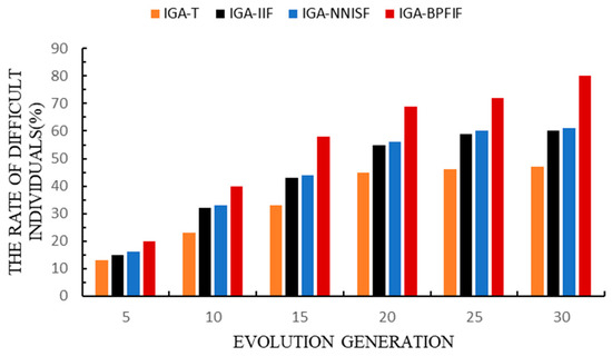 Figure 7 compares the number of different individuals. The number of individual variations of the four algorithms increased with the increase in the number of generations. After 20 iterations, the increasing number of different individuals represented by IGA-T was no longer significant. After 25 iterations, the increasing number of different individuals represented by IGA-IIF was no longer obvious; however, IGA-BPISF experienced significant growth in the number of different individuals. This shows that IGA-BPFIF was more complex than the other three algorithms in terms of time complexity. IGA-BPFIF had more opportunities to find satisfactory solutions. By comparing the evolutionary generations under the algorithm convergence condition in Table 1, the search efficiency of this algorithm was shown to be higher than that of the other algorithms. The reason is that IGA-BPFIF modified the adaptive value of the different individual through the user’s cognitive hesitation, which significantly increased the number of different individuals in each generation, thereby effectively improving the search efficiency of IGA-BPFIF. Therefore, to a certain extent, the results showed that the proposed algorithm can modify the adaptive value of the evolving individual by constructing a quantitative system for aesthetic evaluation and users’ cognitive hesitation, which is conducive to reducing user evaluation noise.