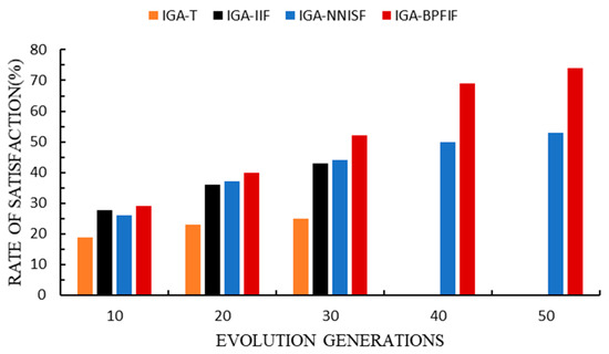 Individuals with fitness greater than 70 were regarded as satisfactory solutions. Figure 8 provides a satisfaction comparison of the four algorithms. When the number of generations was less than 30, the number of satisfying solutions for IGA-BPFIF was greater than those for IGA and IGA-IIF, and when the number of generations was more than 30, the number of satisfying solutions for IGA-BPFIF was 40% more than IGA-NNISF. Therefore, our algorithm effectively improved the success rate of IGA and the satisfaction degree of the users.