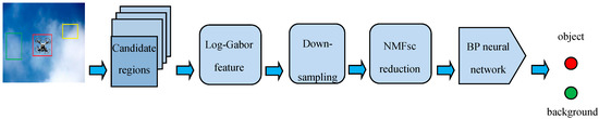 Therefore, a novel UAV target recognition method, based on NMF with sparseness constraint (NMFsc) [12] feature dimension reduction and BP neural network, is proposed in this paper. The Log-Gabor features are extracted from the UAV target image in the first, and then the high-dimensional Log-Gabor features are reduced by the NMFsc algorithm. The BP neural network classifier is used to training and recognition after feature reduction. Compared with PCA (principal component analysis), FLD (Fisher linear discrimination), LPP (locality preserving projection), and KLPP (kernel locality preserving projection), and other algorithms, the method of NMFsc with BP neural network overcomes the problem of both working in real-time and accuracy, and improves the recognition performance. Figure 1 is the flowchart of our algorithm.