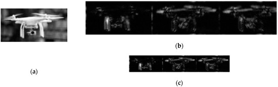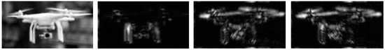 In order to improve the computing speed of filtering and convolution, the scale and orientation of filter are selected as 1 and 3 separately. The parameters are empirically selected, which σθ is 1.5 and σf/f0 is 0.65. Figure 3 shows the convolution result of UAV with one scale and three orientations.
