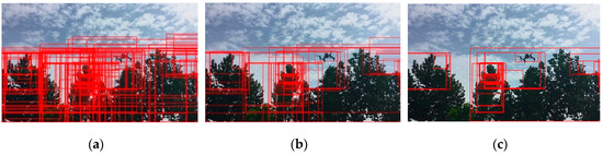 Figure 6 shows the candidate regions with different degree using the EdgeBoxes extraction method. The parameter is optimized for detecting boxes at intersection over union (IoU) of 0.7. The other parameters are set alpha = 0.65, beta = 0.90, opts.multiscale = 0, model.opts.sharpen = 0. The number of candidate regions in Figure 6a is more than the number in Figure 6b with the parameter max number of boxes. However, a large amount of candidate regions increases the calculation work, which will lead to inefficiency. Hence, we use an appropriate parameter, such as Figure 6c. For the image size 500 × 281, the time is 0.068 s. The time difference is about 0.001 s with the parameter “max number of boxes” varying from 50 to 1000.