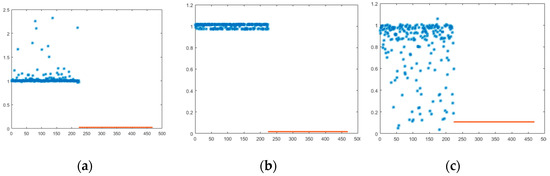 Probability distribution of simulation result for different-dimensional Log-Gabor features: (a) 6144-dimensional Log-Gabor features for NMFsc; (b) 1536-dimensional Log-Gabor features for NMFsc; (c) 12-dimensional Log-Gabor features without NMFsc.