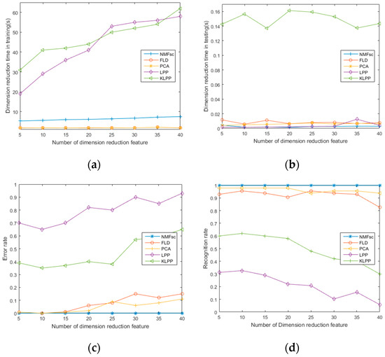 Experimental comparison of different reduction method: (a) dimension reduction time in training; (b) dimension reduction time in testing; (c) error rate; (d) recognition rate.