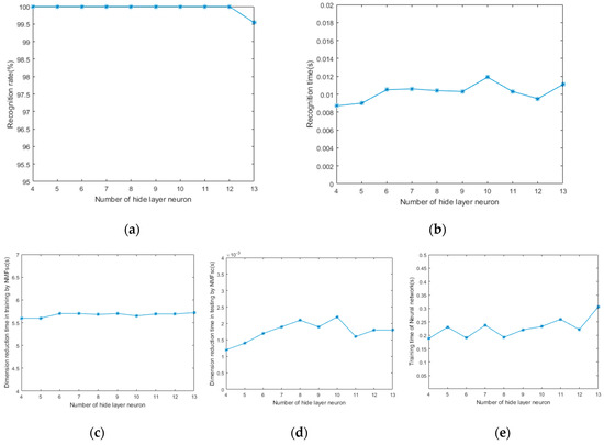 Both the number of hidden layers and the number of hidden layer neurons have an effect on the accuracy and time of recognition for BP neural network. According to Formula (10), the number of neurons of hidden layer ranges from 4 to 13 when using a three-layer network. Precision is set to 0.01. As shown in Figure 10, the performance of training and recognition varies with the number of neurons in the hidden layer. As the number of hidden layer neurons increases, the training time slowly increases. The recognition rate is 100% when the number of neurons is from 4 to 12. While the number of neurons continues to rise, the recognition rate begins to decrease. The result shows that regarding the number of neurons in the hidden layer, more is not necessarily better, and there will be an extreme value. The best number of neurons can be selected to achieve the best recognition performance through many experiments.
