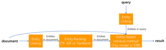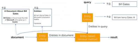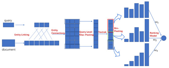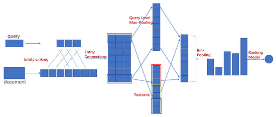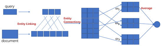 Information retrieval (IR), which facilitates the users in search of the required information, has always been a research hotspot. In traditional IR, words are fundamental to the representation of queries and documents [1,2,3]. The early research (such as vector space model [4] and BM25 [5]) typically built bag-of-words representations for texts, and the relevance between query and document is usually based on handcrafting features. Recently, many types of research have also adopted text embeddings and neural networks, and these neural information retrieval models could extract IR features from training data automatically (such as DSSM [2] and DRMM [3]). However, in the previous IR models which represent texts based on words, the information obtained from the surface forms is insufficient to rank documents. Later, with more abundant semantic information provided by knowledge graphs for document-ranking, entity-based representation has become a direction worth exploring. As shown in Figure 1, in entity-based ranking models [6,7,8], the queries and documents are represented by entities with the help of entity linking [9,10]. Compared with previous IR models, the entity-based ranking models incorporate external knowledge with a document-ranking task, since entities and their semantics in the knowledge graph enable a better understanding of queries and documents.